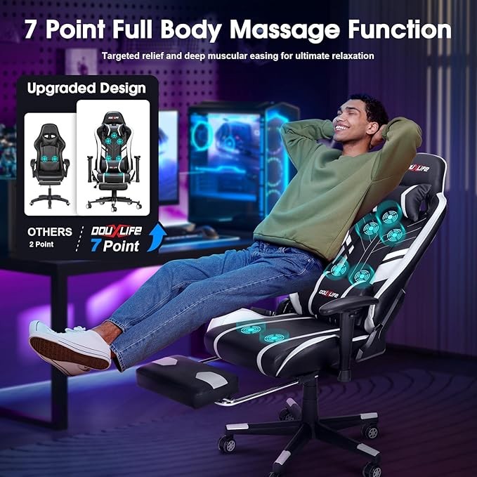 7-Point Massage Gaming Chair, 175° Gaming Recliner with Footrest Ergonomic Computer Gaming Office Chair High Back Video Game Chair with Lumbar Support, Upgraded Version White