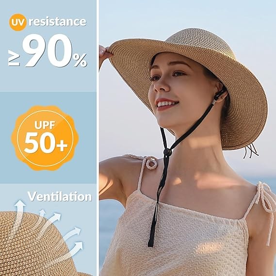 Beach Sun Hats for Women - Wide Brim Straw Womens Summer Hat with Wind Lanyard Roll Up, Foldable Beach Hat UV Protection