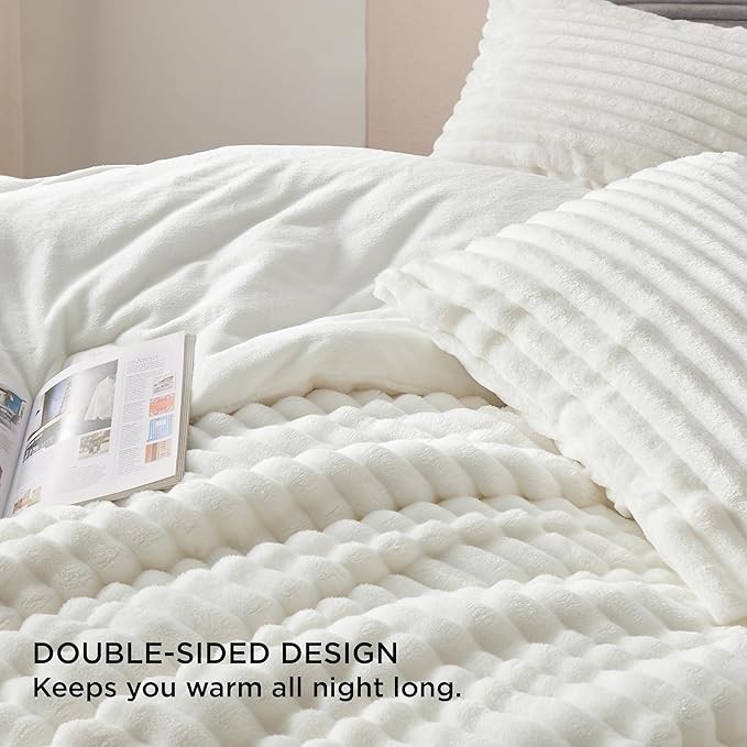 Bedsure Fluffy Comforter Set Queen - Super Soft Faux Fur Bed Set Cream White, Winter Warm Plush Fleece Bedding, 3 Pieces, 1 Shaggy Fuzzy Queen Size Comforter with 2 Pillowcases