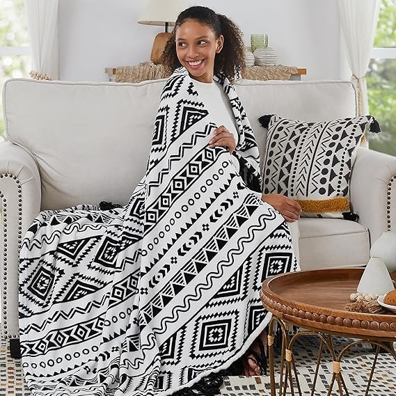CASAAGUSTO Boho Throw Blanket - Black and White Decorative Blankets with Tassel, Printed Flannel Bohemian Blanket for Chair, Bed, Sofa, Couch(50 * 60, Black and White)