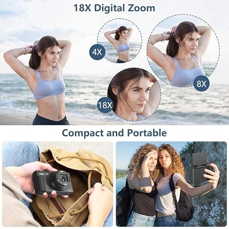 • 【18X Zoom Cameras for Photography with 180°Flip Screen 】Our 4k travel camera features a 180°IPS flip-up 3-inch IPS screen that makes it easy to take selfies, record and share your life's blog. The small digital camera supports 18x digital zoom and can be easily zoomed in and out while in use by pressing the W/T button. The HD photo camera is also equipped with a high-brightness flash to capture clear images in dark environments.(NOTE:It's a digital zoom not an optical zoom, all digital zooms have an effect on picture quality when zoomed in, the more you zoom in the blurrier it gets.)
