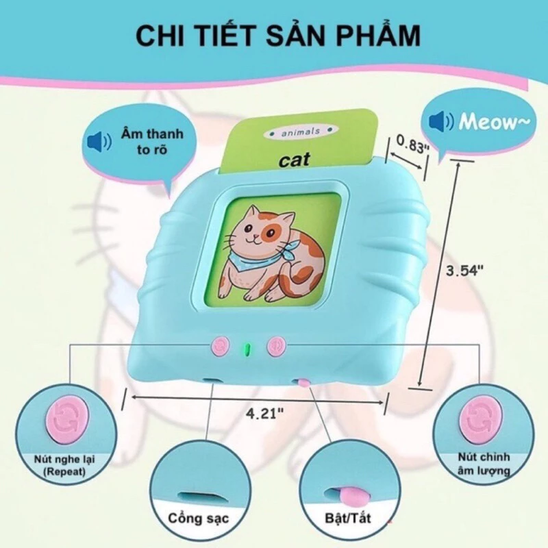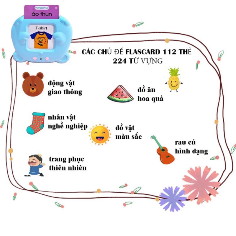 1. Đồ Chơi Máy Đọc Thẻ Từ Vựng Song Ngữ Cho Bé VINATOYS, Máy Đọc Thẻ Flashcard 112 Thẻ Âm Thanh To Sắc Nét Sử Dụng Sạc USB * Thông tin sản phẩm - 3 chế độ đọc: Có thể cài đặt 3 chế độ đọc tùy nhu cầu: ĐỌC RIÊNG TIẾNG ANH/ ĐỌC RIÊNG TIẾNG VIỆT/ ĐỌC ĐỒNG THỜI 2 NGÔN NGỮ ANH - VIỆT - Loại gồm: 112 thẻ 224 từ vựng - Màu sắc: Xanh, Hồng - Bộ đầy đủ gồm: máy + thẻ + dây sạc 2. Đồ Chơi Máy Đọc Thẻ Từ Vựng Song Ngữ Cho Bé VINATOYS, Máy Đọc Thẻ Flashcard 112 Thẻ Âm Thanh To Sắc Nét Sử Dụng Sạc USB ***** Hướng Dẫn Sử Dụng ***** - (1) Bật/Tắt: Nhấn giữ nút nguồn trong 2 giây để bật máy. Nếu trong 5 phút không hoạt động, máy sẽ tự tắt - (2) Nghe lại: Nhấn nút mũi tên xoay tròn để nghe lại khi thẻ được lắp vào - (3) Âm lượng: Nhấn biển tượng loa để tăng/giảm âm lượng - (4) Sạc pin: Chân sạc micro usb (tặng kèm), khi sạc máy hiện đèn đỏ và đèn sẽ tắt khi pin đầy - (5) Ngôn ngữ: Nhấn giữ đồng thời nút lặp lại và nút âm lượng cho đến khi có tiếng tít nhỏ là ngôn ngữ được chuyển đổi. Máy có thể đọc song ngữ, riêng tiếng anh hoặc riêng tiếng việt - (6) Âm nhạc: Nhấn giữ nút âm lượng hơn 4 giây để phát nhạc 3. Đồ Chơi Máy Đọc Thẻ Từ Vựng Song Ngữ Cho Bé VINATOYS, Máy Đọc Thẻ Flashcard 112 Thẻ Âm Thanh To Sắc Nét Sử Dụng Sạc USB - THƯƠNG HIỆU ĐỒ CHƠI VINATOYS CAM KẾT: + Hình ảnh sản phẩm giống 100%. + Chất lượng sản phẩm tốt 100%. + Sản phẩm được kiểm tra kĩ càng, nghiêm ngặt trước khi giao hàng. + Sản phẩm luôn có sẵn trong kho hàng. + Giao hàng ngay khi nhận được đơn hàng. + Hoàn tiền ngay nếu sản phẩm không giống với mô tả. + Giao hàng toàn quốc, nhận hàng thanh toán. + Hỗ trợ đổi trả theo chính sách của Shopee Mall (nếu do lỗi từ nhà sản xuất) + Tư vấn và giải đáp mọi thắc mắc của khách hàng liên quan đến sản phẩm