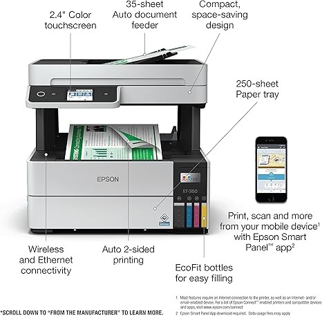 Epson EcoTank Pro ET-5150 Wireless Color All-in-One Supertank Printer with Scanner, Copier, Plus Auto Document Feeder, Large, White