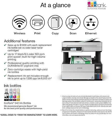 • 2 Years of Unlimited Ink promo valid for ET-5150, ET-5170, ET-5180, ET-5800, ET-5850, ET-5880, ET-16600 or ET-16650 printers purchased from 10/1/2021 to 3/31/2025. Product must be registered within 30 days of purchase. Limit four 542 ink bottles per claim. Each claim cannot contain multiple bottles of the same color. Retain your empty 542 ink bottle for submission along with rebate form. Promotion applies to ink only. Printer covered by Epson 2-year ltd wnty with registration. For promo participation, you must register your product. See manufacturer's website for details.