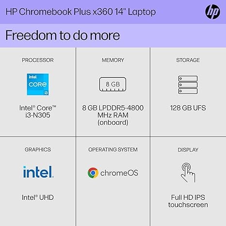 HP Chromebook Plus x360 14 inch Laptop, FHD Touchscreen, Intel Core i3-N305, 8 GB RAM, 128 GB UFS, Intel UHD Graphics, Chrome OS, 14b-cd0010nr (2024)