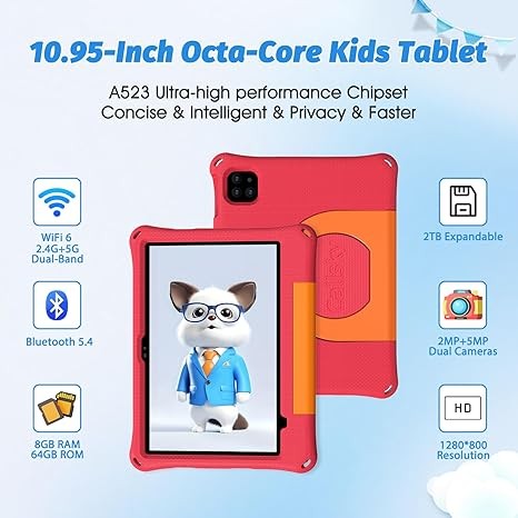 • 【11 Inch Android 14 Kids Tablet】CALLSKY-NOTE kids tablet is equipped with 10.95 inch 1280x800 IPS display, octa-core processor, 8GB(3+5) RAM and 64GB storage (expandable to 2TB via Micro SD card), plus WiFi 6 and Bluetooth 5.4 connectivity, 2MP+5MP Dual Camera, meeting all learning and entertainment needs. The 11 inch kids tablet runs on Android 14 system, featuring a user-friendly interface and easy-to-use operations