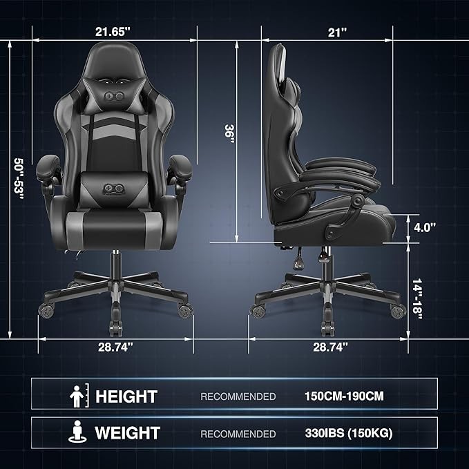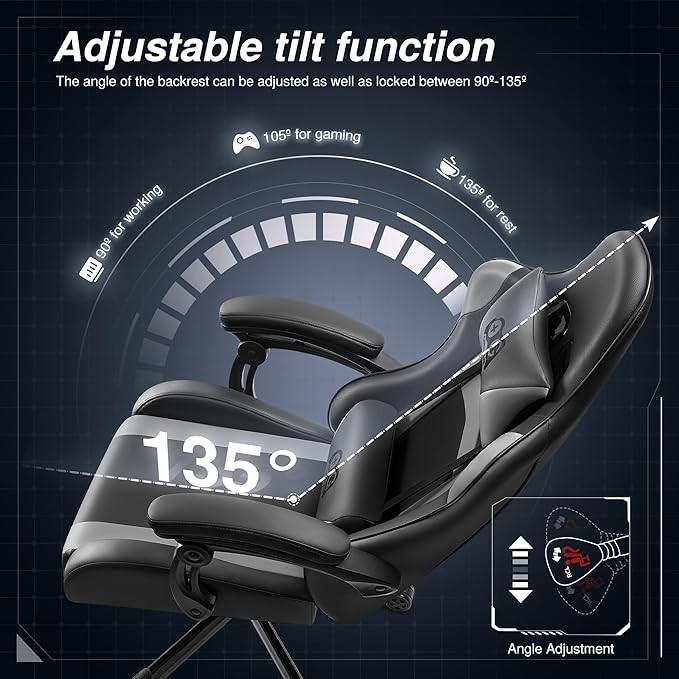 [Multiple adjustments] The backrest of the gaming chair can be tilted between 90º-135º to ensure your comfort throughout extended work and gaming sessions. Also, the height adjustment function allows you to find the ideal height for both working and gaming.