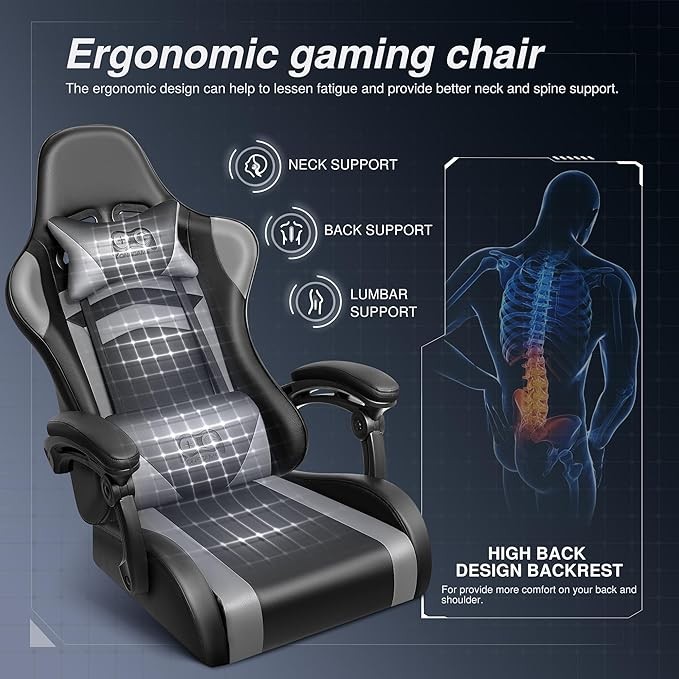 [Ergonomic design] High-density foam is used as padding in the gaming chair for a more comfortable sitting experience, and it also has a flexible headrest and lumbar pillows to give you excellent neck and back support.
