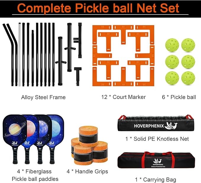 • COMPLETE PICKLEBALL NET SYSTEM - The pickleball net set provide everything you need to get playing right away, including pickle ball net, lightweight pickleball paddles set of 4, pickleball court marking kit, 6 pack of outdoor pickleball balls, 4 addition handle grips. And come with a zippered bag with handle keeping everything organized. Whether you're heading to the local court or taking the game on vacation, you can transport your pickleball gear effortlessly.