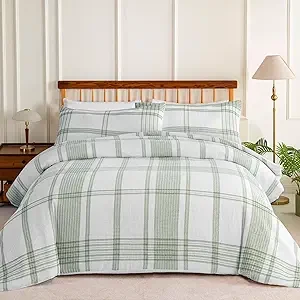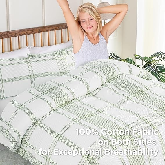 • Stylish Waffle Weave Design: The unique waffle weave texture, white fabric accented by vibrant Green stripes, adds a touch of sophistication and personality to any bedroom. Its visually appealing design brings a contemporary and dimensional look that enhances your decor