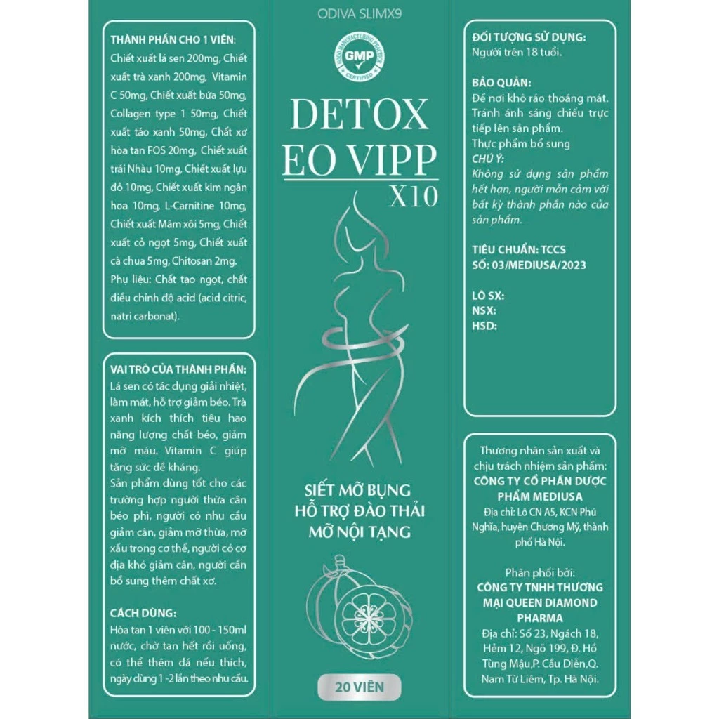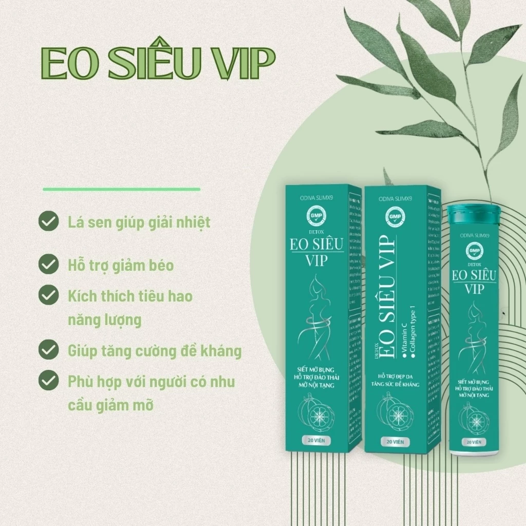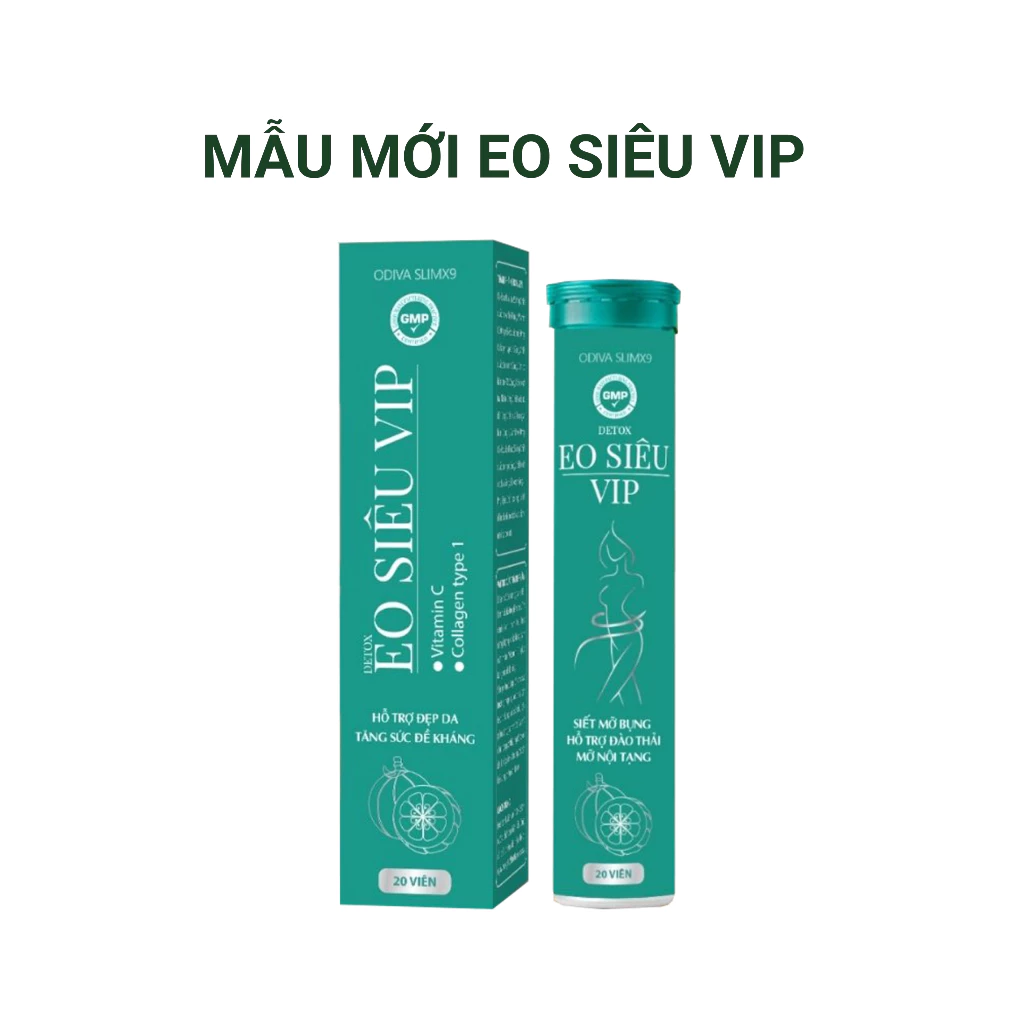 ên sủi giảm cân, giảm mỡ bụng Eo 59 Slim x9, detox vipp x10, siết eo Odiva, không mệt mỏi, mất nước THÔNG TIN SẢN PHẨM: Viên sủi giảm cân, giảm mỡ bụng Eo 59 Slim x9, detox vipp x10 - Thương hiệu: ODIVA - Xuất xứ: Việt Nam - Quy cách : Ống 20 viên - Hạn sử dụng: 24 tháng - Đối tượng sử dụng: Nam Nữ từ 18 tuổi THÀNH PHẦN: Viên sủi giảm cân, giảm mỡ bụng Eo 59 Slim x9, detox vipp x10 - Chiết xuất lá sen - Chiết xuất trà xanh - Vitamin C - Chiết xuất trái bứa - Collagen tuyp 1 - Chiết xuất táo xanh - Chất xơ hoà tan - Chiết xuất trái nhàu - Chiết xuất lựu đỏ - Chiết xuất kim ngân hoa - L-Carnitine - Chiết xuất mâm xôi - Chiết xuất cỏ ngọt - Chiết xuất cà chua - Chitosan - phụ liệu: chất tạo ngọt,điều chỉnh độ acid(acid citric,natri carbonat) CÔNG DỤNG: Viên sủi giảm cân, giảm mỡ bụng Eo 59 Slim x9, detox vipp x10 - Ức chế và chuyển hóa chất béo, ngăn chặn tình trạng tích tụ mỡ thừa - Hạn chế hấp thụ tinh bột, tạo cảm giác no lâu giúp cơ thể không hấp thụ nhiều thức ăn. - Đào thải mỡ thừa thông qua bài tiết - Hỗ trợ tăng cường sức khỏe, giúp cơ thể giảm mỡ mà không lo bị hoa mắt, chóng mặt. - Đốt cháy hiệu quả mỡ thừa tại các vùng da như đùi, bụng, eo,… - Hạn chế hấp thụ tinh bột, ngăn chặn cơn đói bụng - Chuyển hóa mỡ thừa thành năng lượng, không gây mệt mỏi, uể oải - Thanh lọc và đào thải chất độc ra khỏi cơ thể, giúp cơ thể khỏe khoắn, nuôi dưỡng làn da khỏe đẹp. - Giảm Bụng, Đẹp Da, Không Gây Đi Ngoài ƯU ĐIỂM SẢN PHẨM: Viên sủi giảm cân, giảm mỡ bụng Eo 59 Slim x9, detox vipp x10 - Không mất nước, không mất cơ - Không mệt, không đi ngoài - Vị thơm dễ uống ĐỐI TƯỢNG KHÔNG NÊN SỬ DỤNG: - Phụ nữ đang mang thai. - Phụ nữ đang cho con bú dưới 3 tháng tuổi - Người mẫn cảm với 1 số thành phần của sản phẩm. - Người bị huyết áp cao, tim mạch, đái tháo đường, thần kinh, suy gan, suy thận, người đang chữa các benh về ung bướu... CÁCH SỬ DỤNG: Viên sủi giảm mỡ bụng, giảm eo, Eo 59 Slim X9 Odiva - Hòa tan 1 viên với 100-150ml nước, chờ tan hết rồi uống - Có thể dùng với đá - Dùng 1 -2 lần mỗi ngày theo nhu cầu. - Uống sau bữa ăn 30 phút LƯU Ý: SẢN PHẨM KHÔNG PHẢI LÀ THUỐC, KHÔNG CÓ TÁC DỤNG THAY THẾ THUỐC CHỮA BỆNH CÔNG TY TNHH TM&DV GLOW BEAUTY KOREAN Địa chỉ: Số 50, Chính Kinh, Nhân Chính, Thanh Xuân, Hà Nội